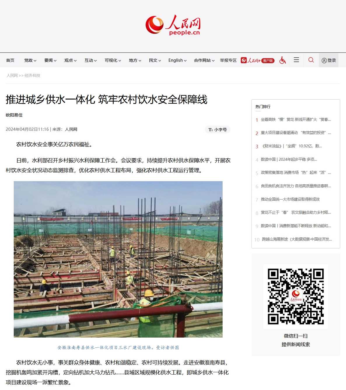 4月2日,人民網(wǎng)報(bào)道中國水務(wù)以鄉(xiāng)村水務(wù)為突破點(diǎn),科學(xué)構(gòu)建完備水網(wǎng)體系和現(xiàn)代化水管理體系,切實(shí)推進(jìn)城鄉(xiāng)供水一體化工作,有效提升鄉(xiāng)村振興生活、生產(chǎn)、生態(tài)用水保障能力。