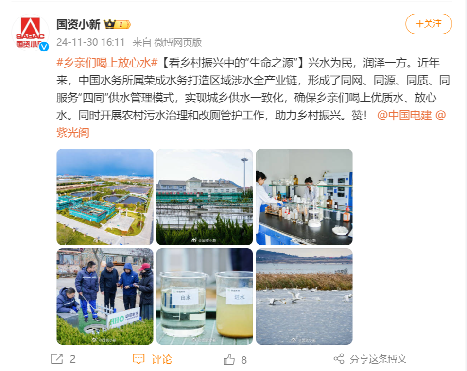近日,紫光閣、國(guó)資小新、中國(guó)電建微博相繼點(diǎn)贊中國(guó)水務(wù)所屬榮成水務(wù)打造區(qū)域涉水全產(chǎn)業(yè)鏈,聚焦供水與排水(治污)兩大主業(yè),推動(dòng)城鄉(xiāng)供水一體化的高標(biāo)準(zhǔn)建設(shè)、高安全運(yùn)營(yíng)、高質(zhì)量發(fā)展。此次微博發(fā)布累計(jì)粉絲傳播到達(dá)1800萬+,營(yíng)造了中國(guó)水務(wù)擦亮“水名片”、做好“水文章”、講好水務(wù)故事的良好氛圍,展示了公司高質(zhì)量發(fā)展的“綠色答卷”。