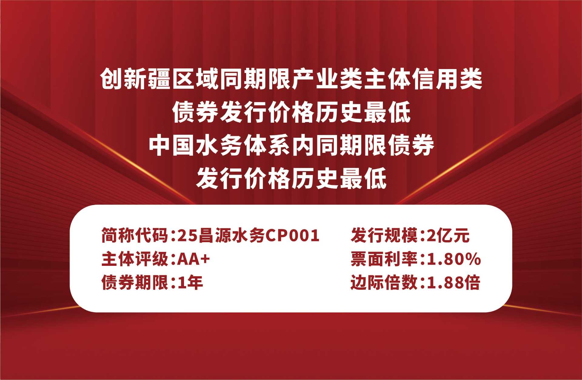 12月1日,昌源水務(wù)順利完成2025年度第一期短期融資券發(fā)行,發(fā)行規(guī)模2億元。此次發(fā)行創(chuàng)下兩項(xiàng)歷史新低——新疆區(qū)域同期限產(chǎn)業(yè)類主體信用類債券發(fā)行價(jià)格最低、中國水務(wù)體系內(nèi)同期限債券發(fā)行價(jià)格最低,充分彰顯了資本市場(chǎng)對(duì)中國水務(wù)賦能成效及昌源水務(wù)綜合實(shí)力的高度認(rèn)可。