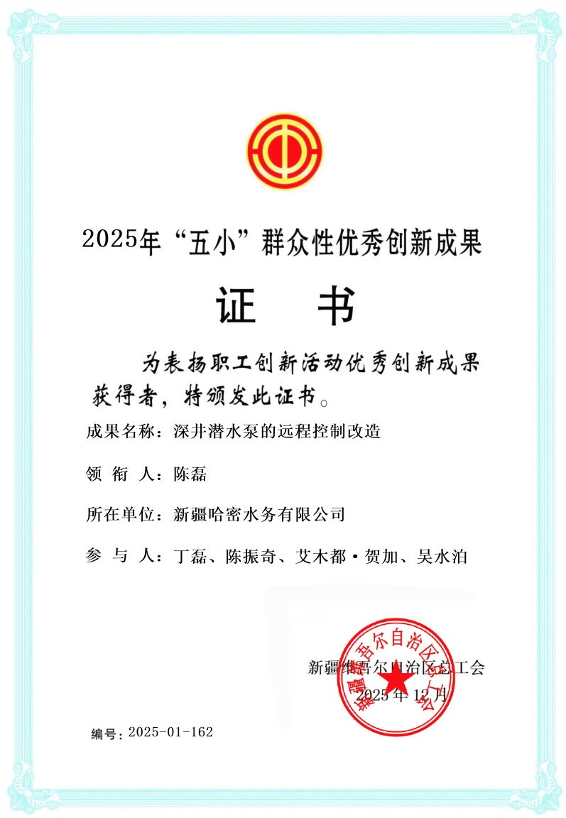 近日,新疆維吾爾自治區(qū)總工會(huì)發(fā)布《關(guān)于公布2025年自治區(qū)職工創(chuàng)新活動(dòng)優(yōu)秀創(chuàng)新成果獎(jiǎng)勵(lì)名單的通知》,由中國(guó)水務(wù)所屬昌源集團(tuán)哈密水務(wù)生產(chǎn)技術(shù)部團(tuán)隊(duì)完成的“深井潛水泵的遠(yuǎn)程控制改造”項(xiàng)目,獲評(píng)新疆維吾爾自治區(qū)2025年度“五小”群眾性優(yōu)秀創(chuàng)新成果。