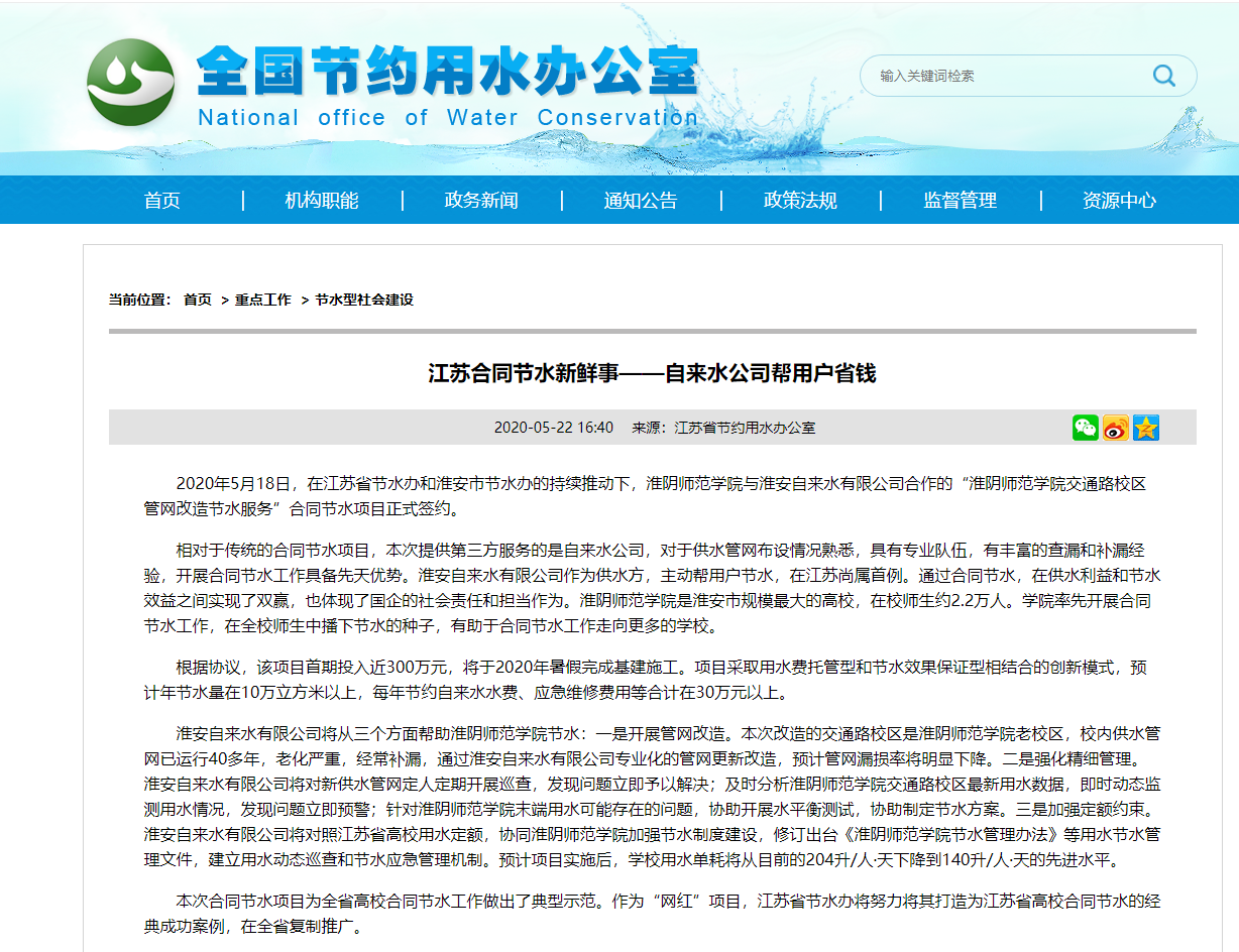 中國水務(wù)高度重視高校合同節(jié)水工作,供水企業(yè)做節(jié)水,體現(xiàn)了企業(yè)在注重經(jīng)濟效益的同時,更加注重社會效益的高度政治站位。該項目得到了江蘇省節(jié)水辦、淮安市水利局的大力支持。淮安水司將發(fā)揮技術(shù)優(yōu)勢,努力把該項目建設(shè)成全國高校合同節(jié)水示范工程、標(biāo)桿項目,并以該項目為契機,努力成為江蘇省合同節(jié)水市場的主力軍,為建設(shè)環(huán)境友好型和資源節(jié)約型社會做出應(yīng)有的貢獻(xiàn),并為《高校合同節(jié)水項目實施導(dǎo)則》標(biāo)準(zhǔn)的完善積累豐富經(jīng)驗。