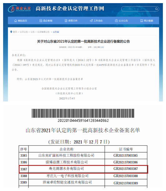 2022年1月4日,全國高新技術(shù)企業(yè)認(rèn)定管理工作領(lǐng)導(dǎo)小組辦公室發(fā)布《關(guān)于山東省2021年認(rèn)定的第一批高新技術(shù)企業(yè)進(jìn)行備案的公告》,山東水務(wù)所屬壽光清源水務(wù)有限公司首次名列山東省2021年認(rèn)定的第一批高新技術(shù)企業(yè)名單。