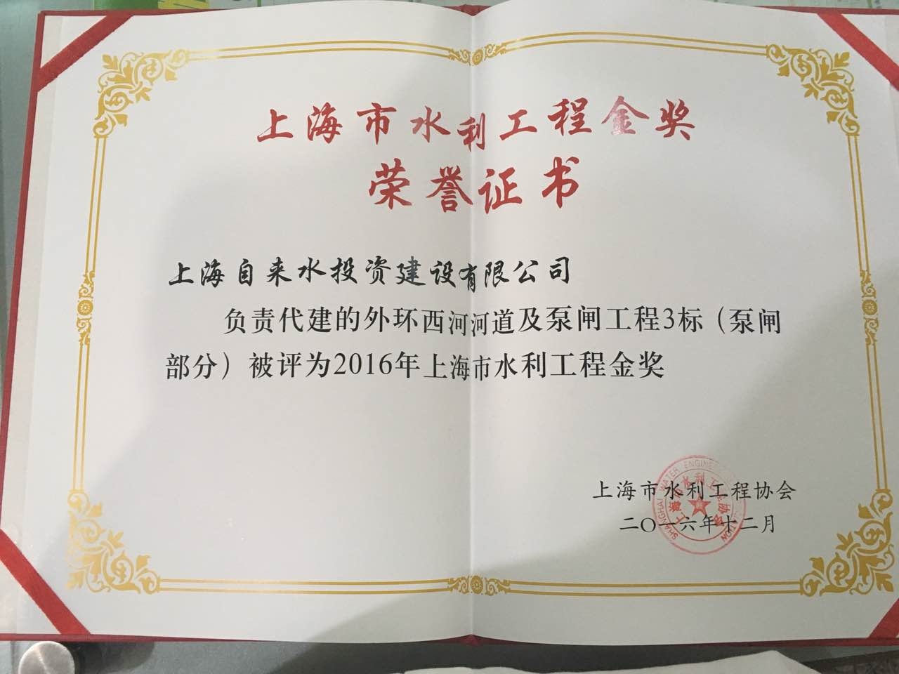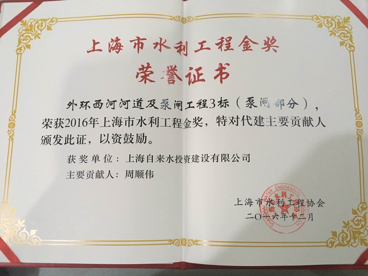 由上海自來水投資建設(shè)有限公司負(fù)責(zé)建設(shè)的外環(huán)西河河道及泵閘工程3標(biāo)(泵閘部分)被上海市水利工程協(xié)會(huì)評(píng)為2016年“上海市水利工程金獎(jiǎng)”,該項(xiàng)目主要貢獻(xiàn)人周順偉獲榮譽(yù)表彰。