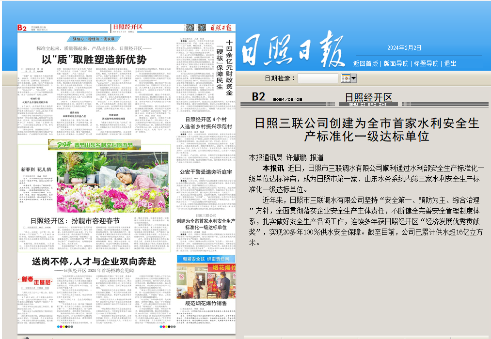 2月2日,《日照日報》報道山東水務所屬日照三聯(lián)公司順利通過水利部安全生產(chǎn)標準化一級單位達標評審,成為日照市第一家、山東水務系統(tǒng)內(nèi)第三家水利安全生產(chǎn)標準化一級達標單位。