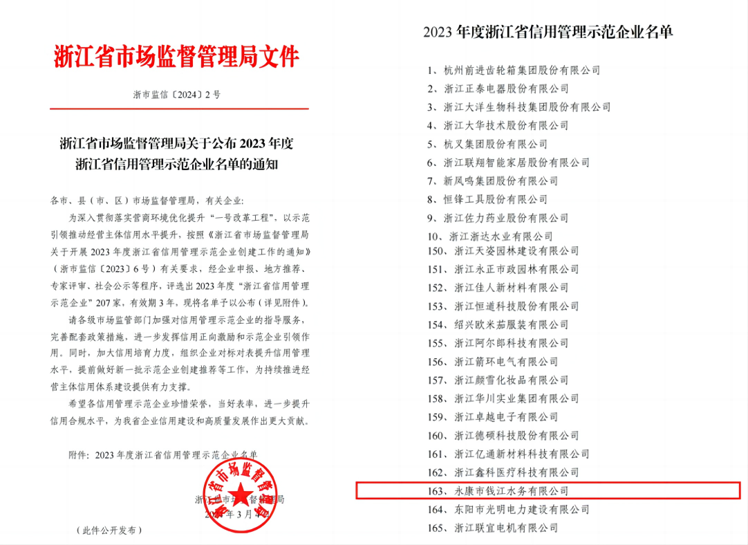 近日,浙江省市場監(jiān)督管理局公布2023年度浙江省信用管理示范企業(yè)名單,錢江水利開發(fā)股份有限公司下屬永康市錢江水務(wù)有限公司榜上有名,獲評“2023年度浙江省信用管理示范企業(yè)”。