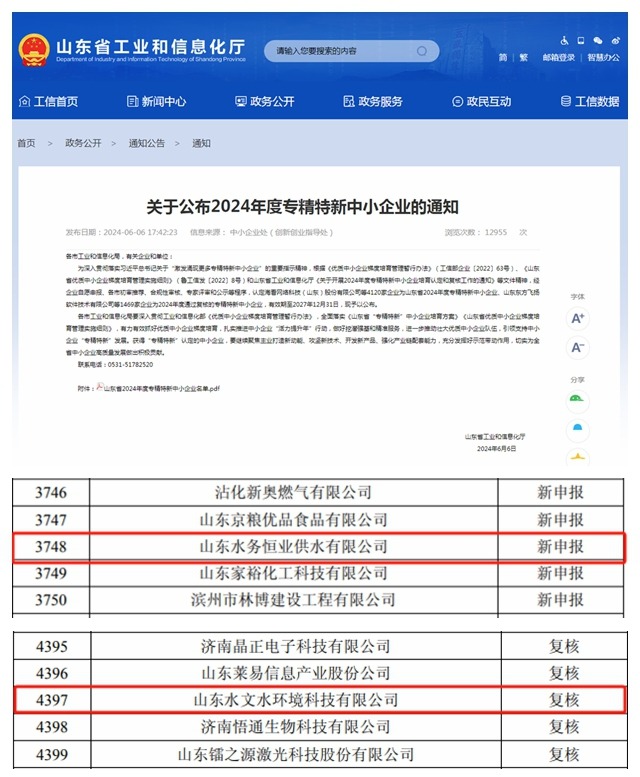近日,山東省工業(yè)和信息化廳公布2024年度專精特新中小企業(yè)名單,山東區(qū)域總部水文科技、沾化恒業(yè)分別通過2024年度專精特新中小企業(yè)復(fù)核和2024年度專精特新中小企業(yè)認(rèn)定。