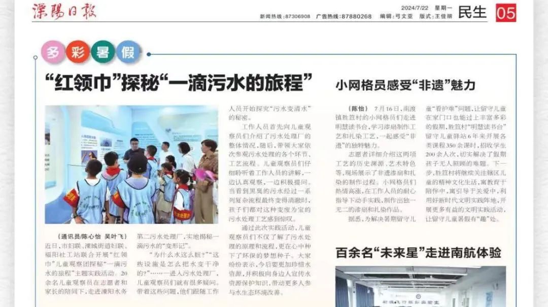 近日,《溧陽日?qǐng)?bào)》報(bào)道了在華東區(qū)域總部溧陽水務(wù)第二污水處理廠節(jié)水科普基地開展的實(shí)踐活動(dòng)。該節(jié)水科普基地是溧陽水務(wù)搭建的面向社會(huì)開放的、傳播節(jié)水知識(shí)、推廣節(jié)水措施、提升節(jié)水意識(shí)的公益平臺(tái),接待前來參觀學(xué)習(xí)的社會(huì)各界人士超2500人次。