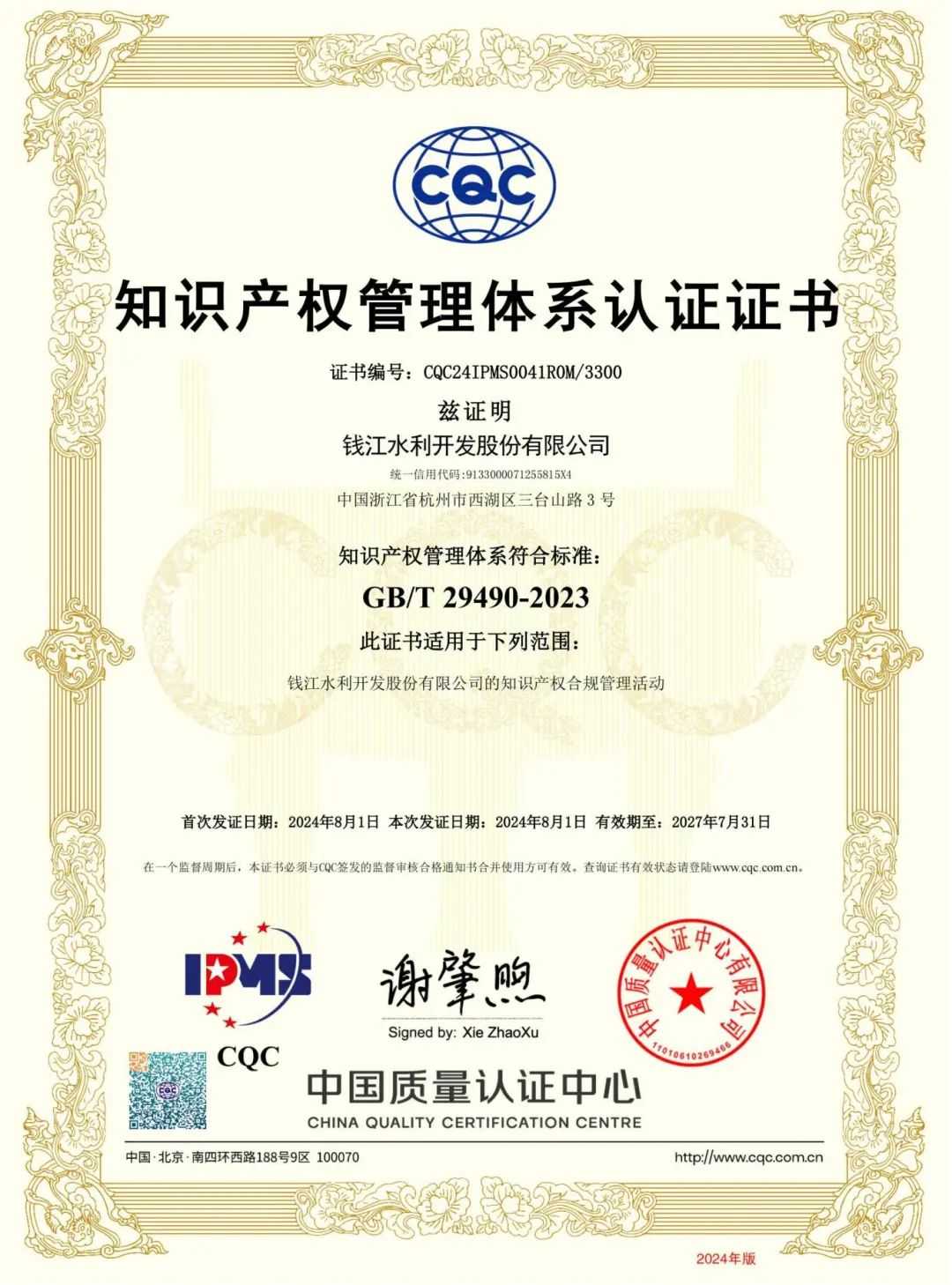 錢江水利深知知識產(chǎn)權(quán)是企業(yè)核心競爭力的關(guān)鍵所在,不僅加大專利申請和商標注冊力度,還建立完善的知識產(chǎn)權(quán)管理體系,確保每一項科研成果都能及時轉(zhuǎn)化為有效的知識產(chǎn)權(quán)資產(chǎn)。截至目前,錢江水利已累計獲得國家授權(quán)專利62項并積極參與國內(nèi)外行業(yè)標準制定工作,僅2024年上半年,公司新增授權(quán)知識產(chǎn)權(quán)13項,涵蓋供水技術(shù)、信息化技術(shù)、污水處理、水質(zhì)檢測等多個領(lǐng)域,進一步提升了行業(yè)話語權(quán)和市場競爭力。
