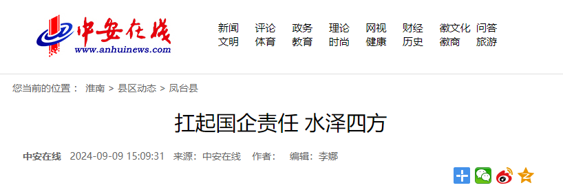 近日,安徽省省直重點(diǎn)新聞媒體中安在線以《扛起國(guó)企責(zé)任,水澤四方》為題,對(duì)鳳臺(tái)華水水務(wù)有限責(zé)任公司夏季保供情況進(jìn)行報(bào)道。