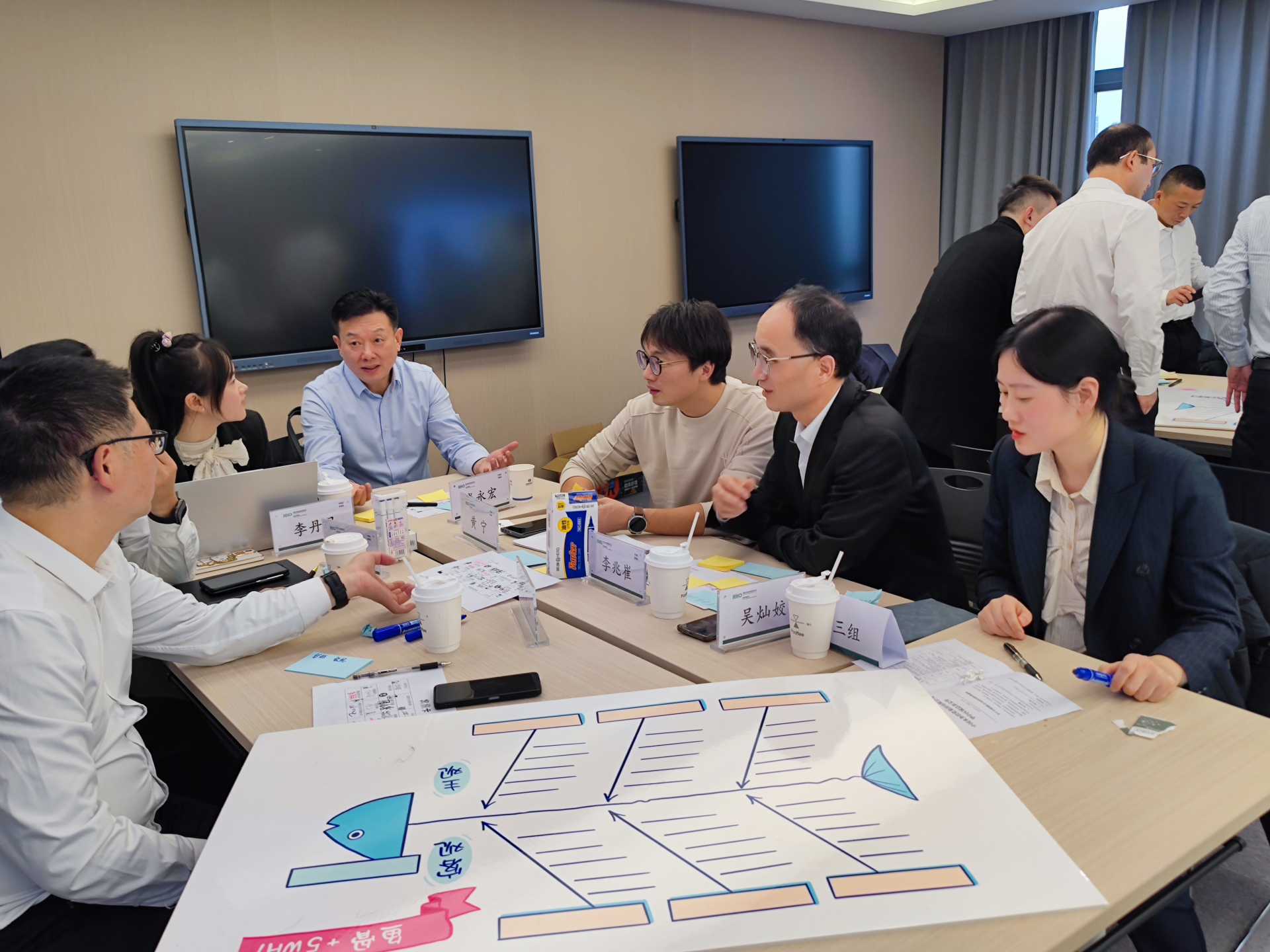 活動(dòng)中,四組學(xué)員圍繞“如何在業(yè)務(wù)開拓時(shí)期發(fā)揮宣傳工作的作用”以及“如何將科技研發(fā)成果轉(zhuǎn)化為業(yè)務(wù)發(fā)展推動(dòng)力”兩個(gè)主題展開深入討論。現(xiàn)場(chǎng)氣氛熱烈,學(xué)員們積極參與,通過頭腦風(fēng)暴、團(tuán)隊(duì)列名、5why+魚骨圖分析法等多種研討工具,進(jìn)行了充分的交流和思考,尋找解決辦法,發(fā)揮了團(tuán)隊(duì)的智慧和力量。經(jīng)過熱烈的討論,學(xué)員們不僅消除了陌生感,建立了良好的團(tuán)隊(duì)協(xié)作關(guān)系,還對(duì)主題有了更深入的理解,找出了根本原因,并提出了一系列切實(shí)可行的解決辦法,涵蓋了宣傳策略、科技研發(fā)與業(yè)務(wù)融合等多個(gè)方面,為華中區(qū)域總部的發(fā)展提供了有益的參考。