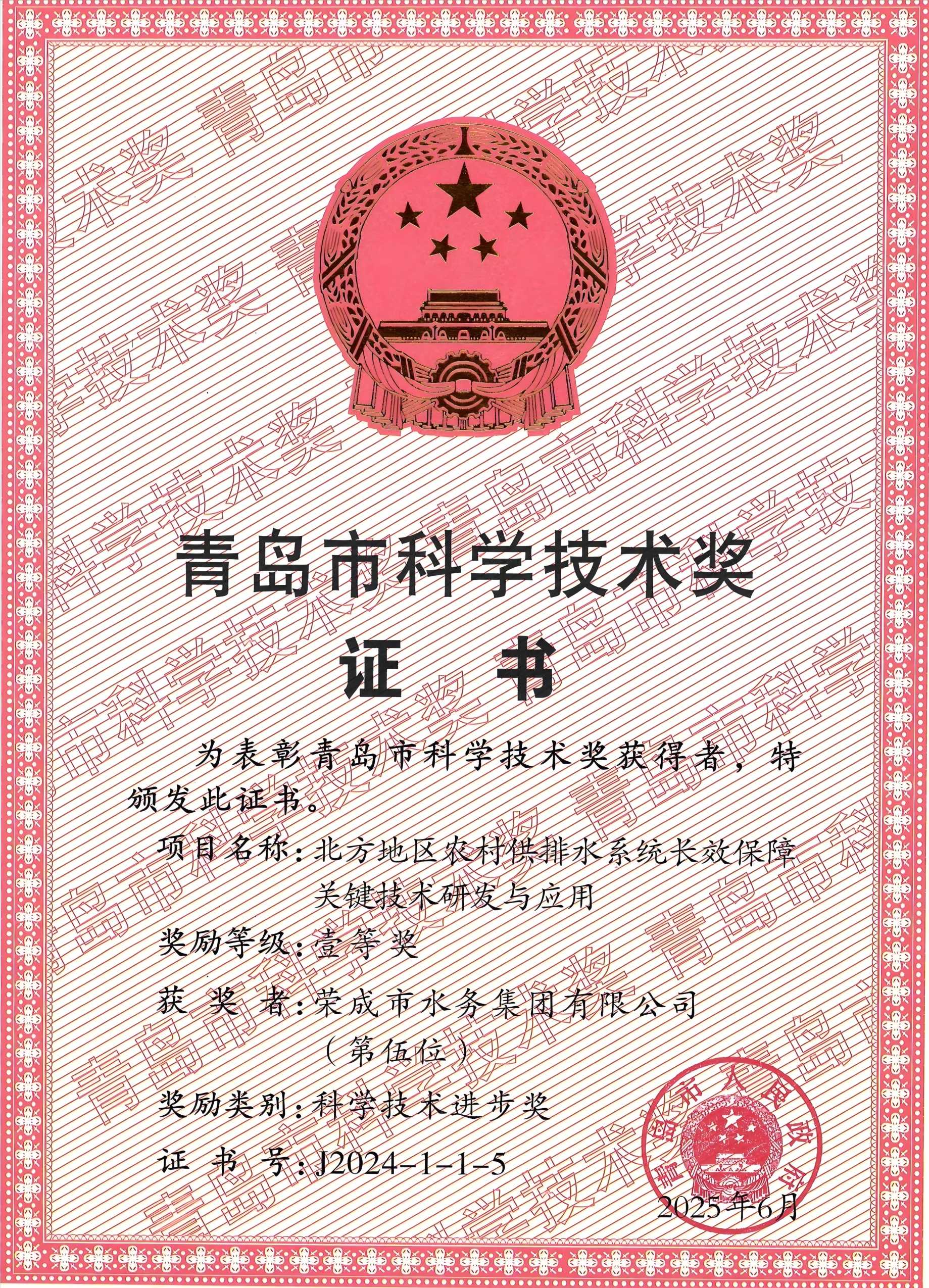 近日,青島市人民政府公布2024年度青島市科學(xué)技術(shù)獎(jiǎng)獲獎(jiǎng)名單。由青島理工大學(xué)牽頭,榮成市水務(wù)集團(tuán)有限公司、中國(guó)市政工程中南設(shè)計(jì)研究總院有限公司等單位共同完成的“北方地區(qū)農(nóng)村供排水系統(tǒng)長(zhǎng)效保障關(guān)鍵技術(shù)研發(fā)與應(yīng)用”項(xiàng)目,榮獲科學(xué)技術(shù)進(jìn)步獎(jiǎng)一等獎(jiǎng),榮成水務(wù)黨委委員、副總經(jīng)理、工會(huì)主席張軍曉作為項(xiàng)目組主要成員同獲殊榮。