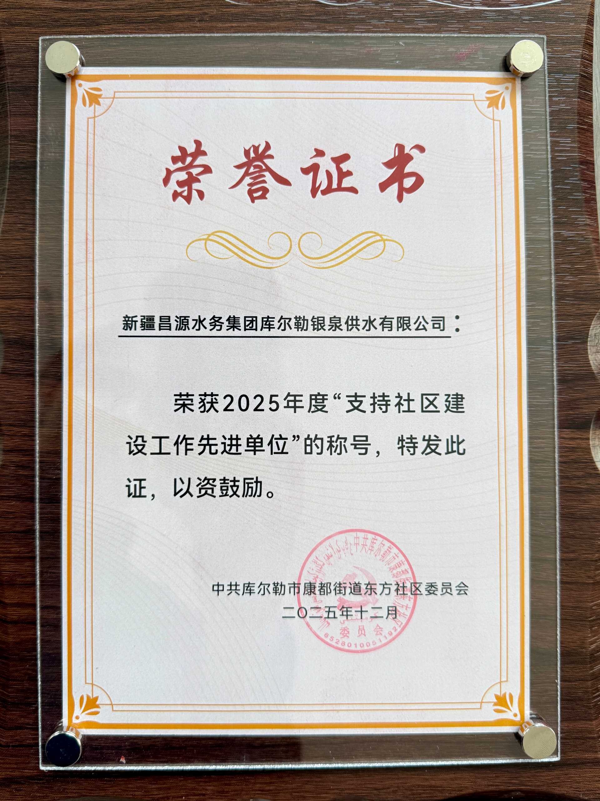 在12月19日召開的新疆庫爾勒市康都街道東方社區(qū)年度總結(jié)表彰大會上,昌源集團所屬庫爾勒供水被授予“支持社區(qū)建設(shè)工作先進單位”稱號,庫爾勒供水黨總支書記、副總經(jīng)理李林同時榮獲“支持社區(qū)工作好領(lǐng)導(dǎo)”榮譽稱號。