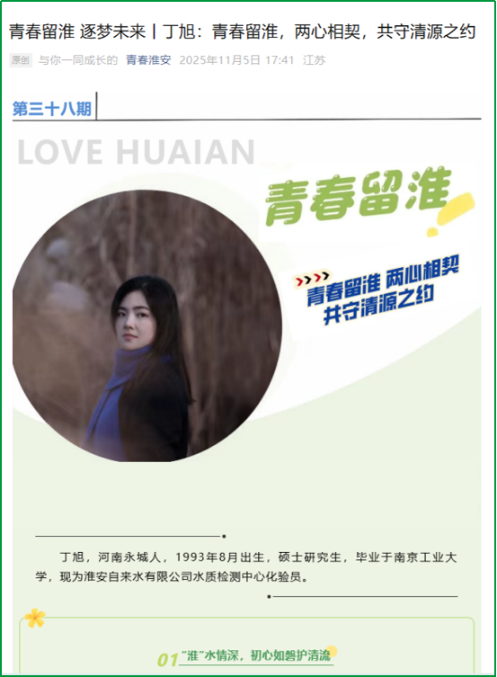 近日,共青團(tuán)淮安市委官方微信公眾號《青春留淮 逐夢未來》特別專欄發(fā)布華東區(qū)域總部下屬淮安水司青年職工丁旭的先進(jìn)事跡。這不僅是對丁旭扎根水質(zhì)檢測一線、以青春護(hù)清流的奮斗歷程的高度認(rèn)可,更是對淮安水司團(tuán)委深耕青年培養(yǎng)、賦能青年成長工作的充分肯定,為全體青年樹立“立足崗位踐使命、扎根淮安共發(fā)展”的優(yōu)秀標(biāo)桿。