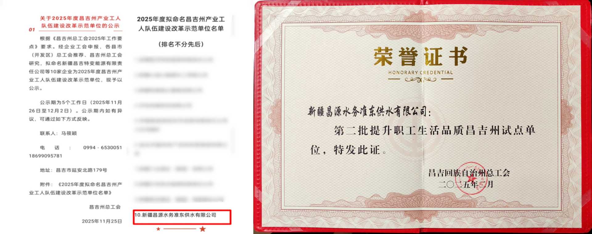 近日,新疆昌吉回族自治州總工會(huì)公示2025年度評(píng)選結(jié)果,昌源集團(tuán)準(zhǔn)東供水公司憑借在產(chǎn)業(yè)工人隊(duì)伍建設(shè)與職工生活品質(zhì)提升方面的扎實(shí)工作,成功獲評(píng)“2025年度昌吉州產(chǎn)業(yè)工人隊(duì)伍建設(shè)改革示范單位”,并入選第二批“昌吉州提升職工生活品質(zhì)試點(diǎn)單位”。