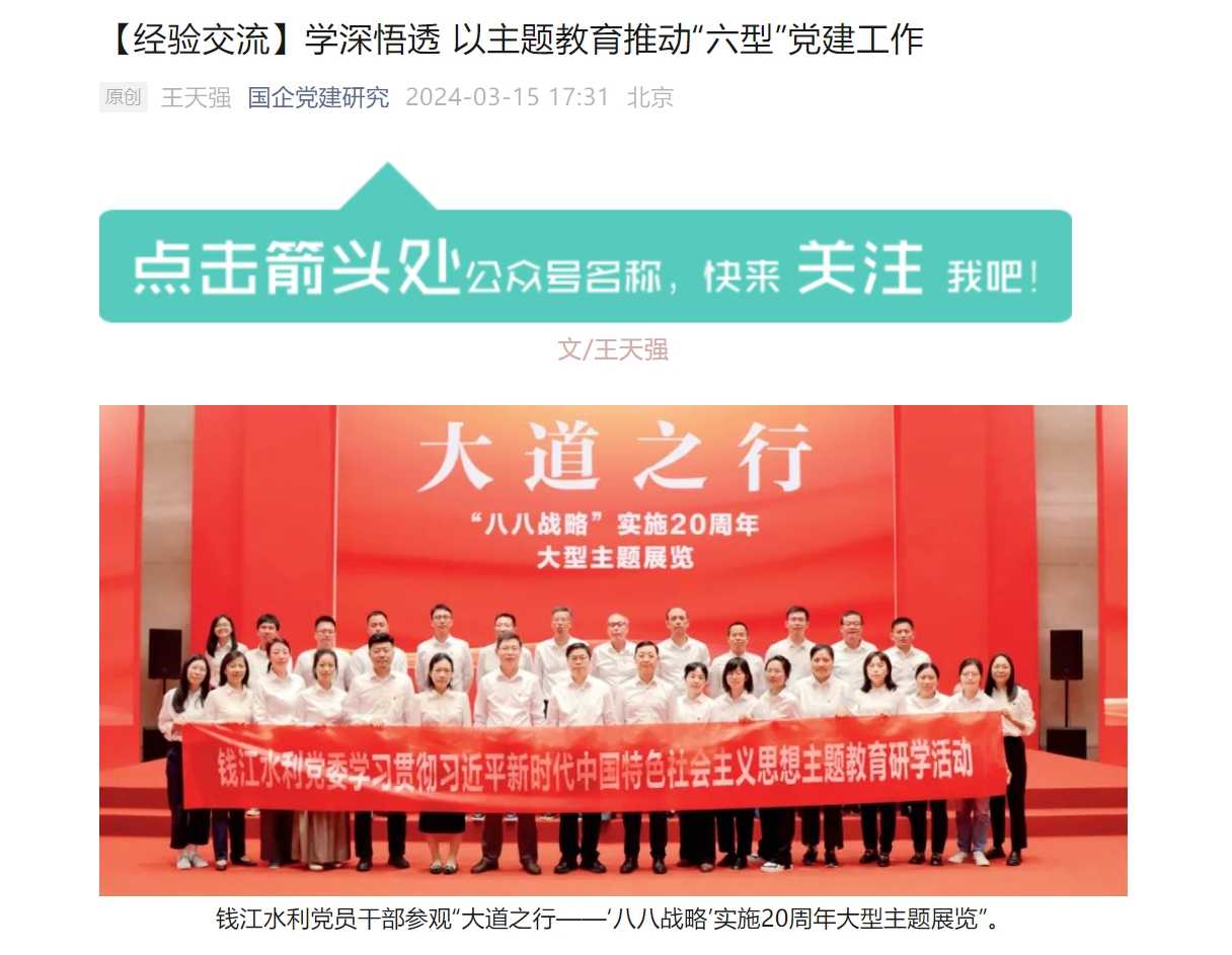 近日,《國企》雜志刊發(fā)中國水務下屬錢江水利第二批主題教育經(jīng)驗做法——《學深悟透 以主題教育推動“六型”黨建工作》。
