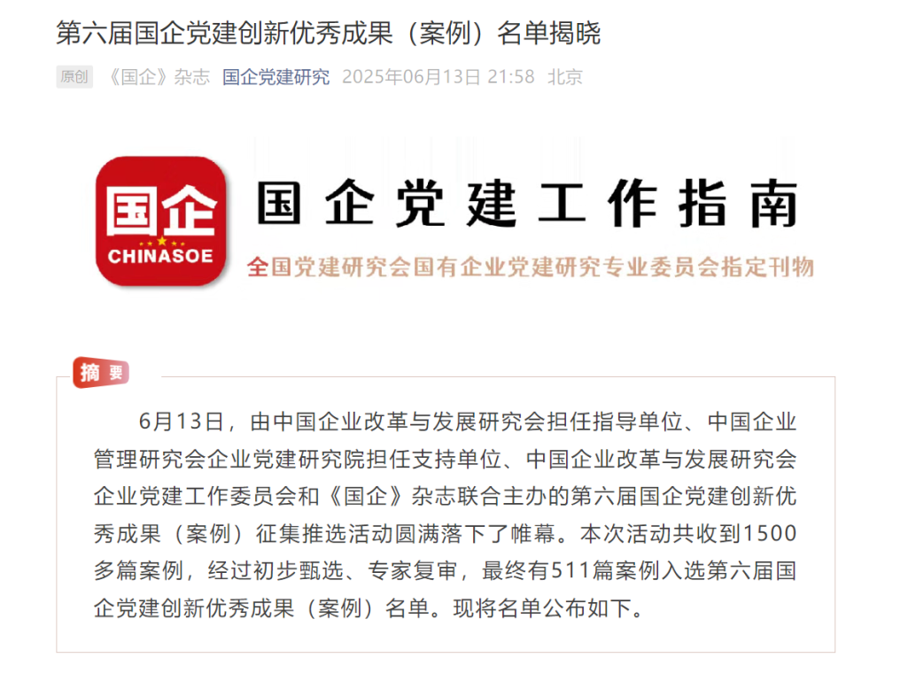 近日,由中國企業(yè)改革與發(fā)展研究會擔任指導單位、中國企業(yè)管理研究會企業(yè)黨建研究院擔任支持單位、中國企業(yè)改革與發(fā)展研究會企業(yè)黨建工作委員會和《國企》雜志聯合主辦的第六屆國企黨建創(chuàng)新優(yōu)秀成果(案例)公布了入選名單,中國水務所屬華東區(qū)域總部《“小水滴 全服務”——金寨金葉供水有限公司黨總支黨建品牌的創(chuàng)新實踐》從1500多篇案例中脫穎而出,成功入選第六屆國企黨建創(chuàng)新優(yōu)秀成果(案例)名單。